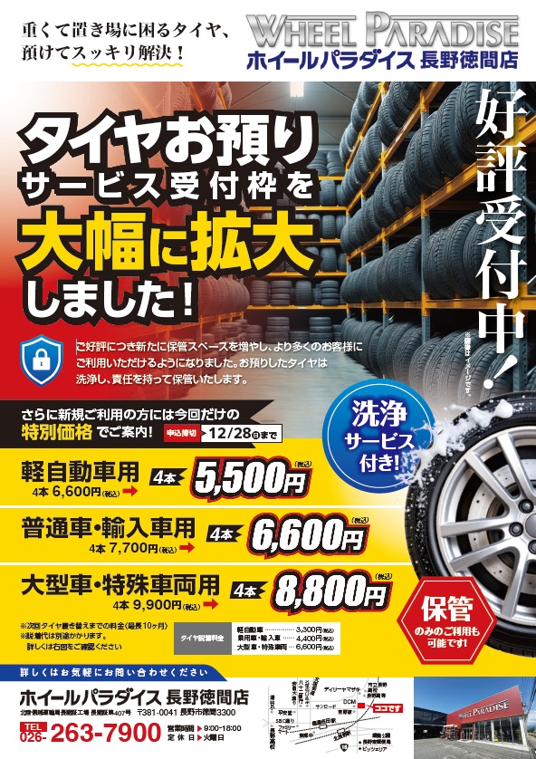 ※タイヤ保管サービス枠を大幅に拡大しました!! 2025年10月31日 タイヤ・ホイール, お知らせ, ピックアップ ご好評につき、タイヤ保管サービス受付枠を大幅に拡大いたしました✨ また今シーズンに限りキャンペーン価格にてお受けいたします! ご検討の方はぜひお気軽にお問い合わせください! ※記載価格は半期料金(最長10ヶ月) ※脱着代は別途かかります。